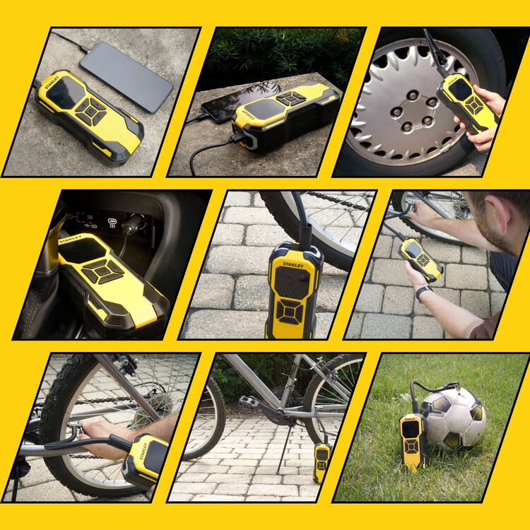 Dụng cụ đa năng bơm xe, đèn pin Led, sạc dự phòng STANLEY Model SXIF0101 là một thiết bị đa năng, có khả năng bơm hơi cho xe ô tô, xe máy, xe đạp, bóng đá, bóng rổ, phao bơi,… với tốc độ bơm nhanh và tự động ngắt khi đạt áp suất mục tiêu.