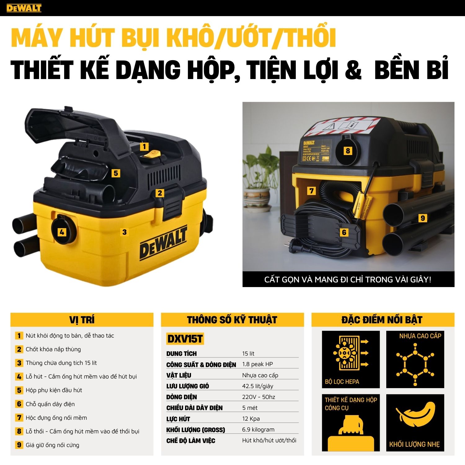 Ngoài những đặc điểm trên, Dewalt DXV15T cũng được trang bị dây điện và các phụ kiện nối dài, giúp bạn tiếp cận các khu vực xa hơn mà không cần di chuyển máy hút bụi quá nhiều. Điều này rất hữu ích khi bạn cần làm sạch các khu vực lớn hoặc khi không có nguồn điện gần.