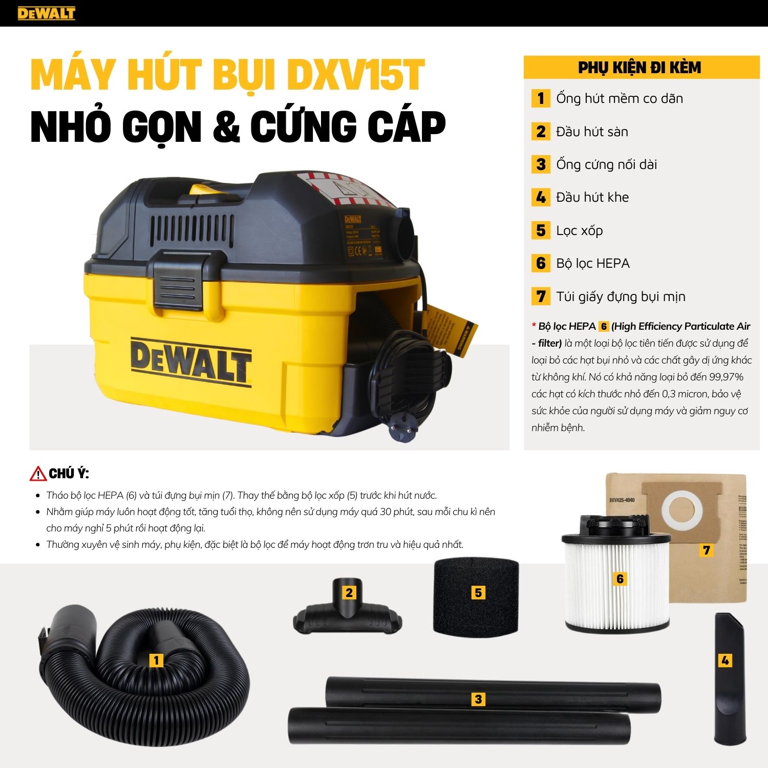 Điểm đáng chú ý khác của Dewalt DXV15T là việc trang bị bộ lọc HEPA. Với bộ lọc này, máy hút bụi có khả năng loại bỏ 99,97% các hạt bụi nhỏ đến 0,3 micron, bảo vệ sức khỏe của bạn và ngăn chặn sự lan truyền của các chất gây dị ứng và bệnh tật.