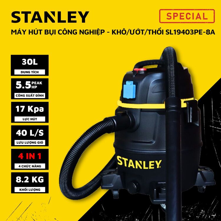 Máy hút bụi Công nghiệp 4 chức năng Stanley SL19403PE-8A có công suất tối đa 5.5 peak HP đem đến lực hút 17Kpa và lưu lượng gió 40L/s, máy hút bụi sử dụng điện áp 220V cung cấp hiệu suất cao và năng lượng tối đa trong việc vệ sinh nhà cửa, kho xưởng… Đặc biệt máy có 4 chế độ hút bụi ướt, hút bụi khô, chế độ thổi mạnh mẽ và thêm 1 chế độ dùng chung với các dụng cụ powertools giúp vệ sinh các ngóc nghách một cách dễ dàng nhất. Máy có dung tích 30L rất thoải mái để vệ sinh cả ngôi nhà, kho xưởng…