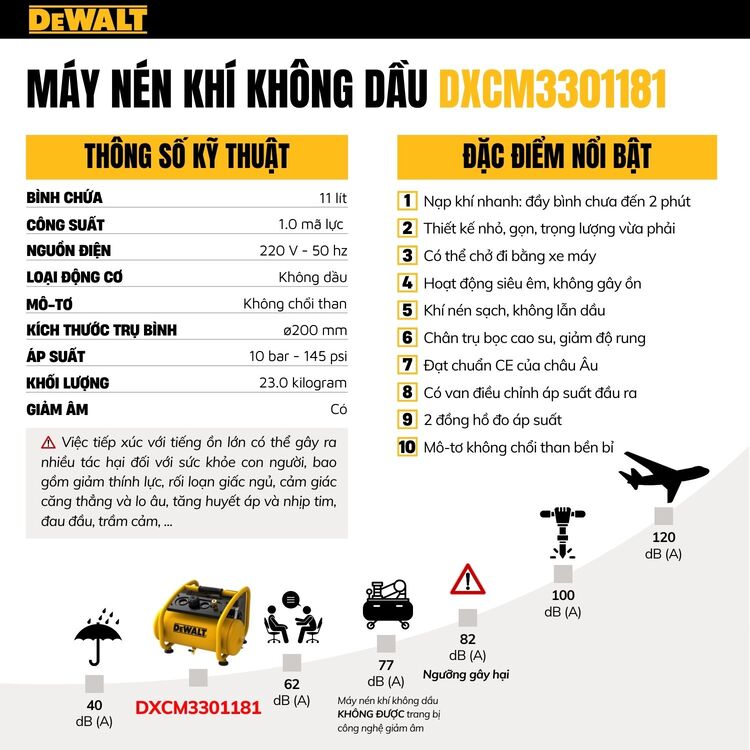 Máy nén khí không dầu 11L DeWALT DXCM3301181 thuộc thương hiệu DeWALT nổi tiếng của Hoa Kì.
