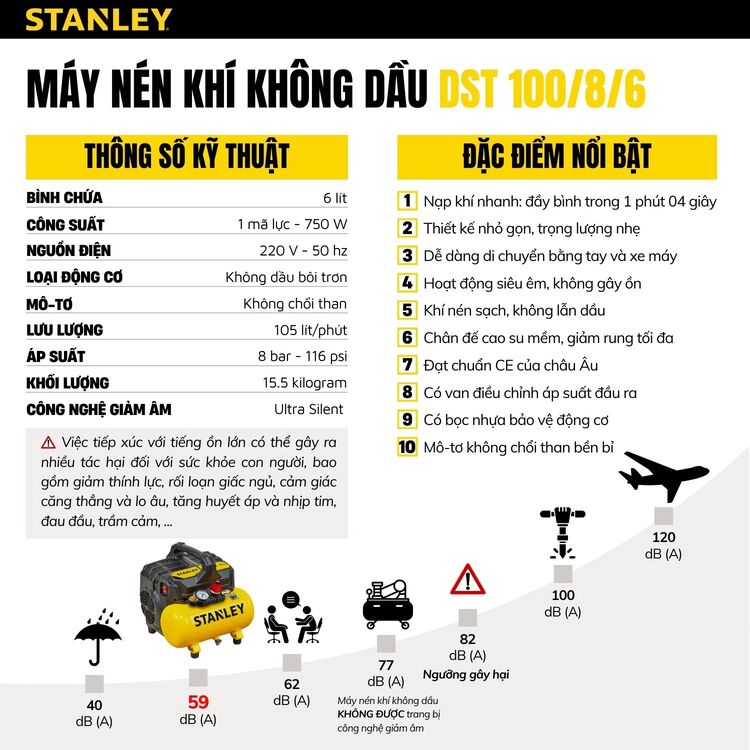 Bên canh đó Máy nén khí không dầu 6L Stanley DST100/8/6 còn được trang bị công nghệ siêu giảm âm Ultra Silent của Stanley. Từ đó độ ồn của máy được giảm hoàn toàn chỉ ở mức 59dB.
