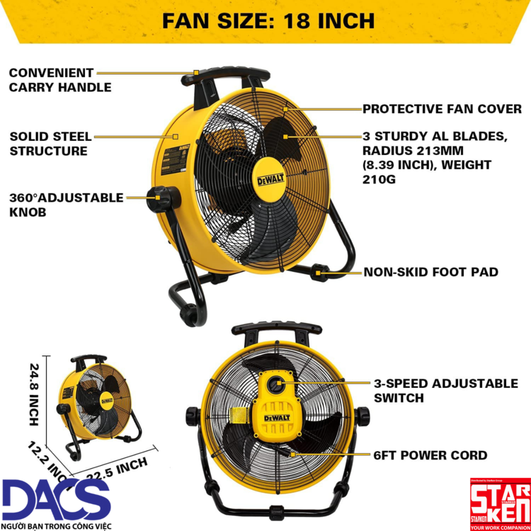 Quạt Công nghiệp Dewalt 18″ DXF1832 được sản xuất với tiêu chuẩn khắc khe nhất của tập đoàn Stanley như motor có cảm nhiệt bảo vệ khi vận hành, cánh quạt 100% bằng nhôm nhẹ và bền, các khung được sơn tỉnh điện rất đẹp…. giúp quạt có thể vận hành trong môi trường và điều kiện khắc khe của thời tiết nhiệt đới