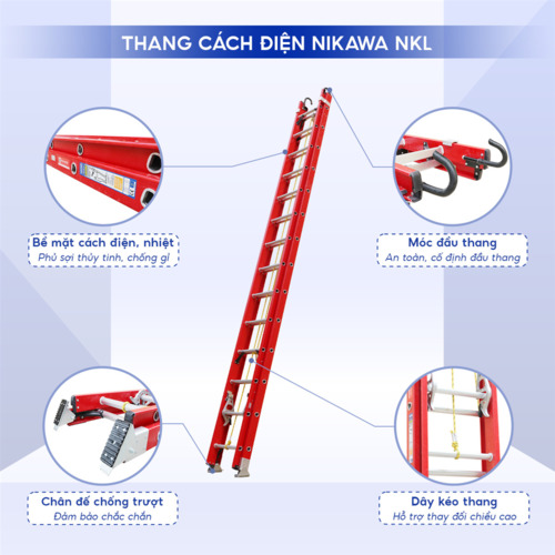 Thang cách điện Nikawa là một loại thang được thiết kế đặc biệt để sử dụng trong các công việc liên quan đến điện, giúp đảm bảo an toàn cho người sử dụng khi làm việc ở độ cao. Thang này thường được làm từ vật liệu cách điện, như nhựa hoặc composite, để ngăn chặn dòng điện truyền qua.