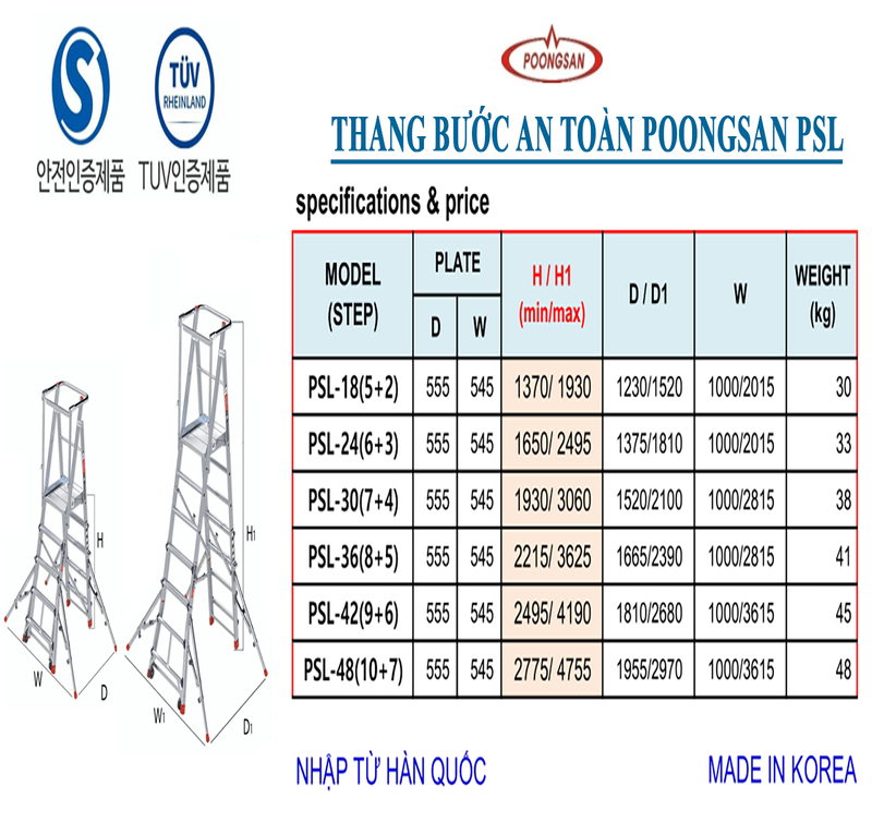 Thang nhôm an toàn Poongsan PSL có chất lượng tốt, được nhập khẩu từ Hàn Quốc, đạt chuẩn an toàn EN-131 và có tải trọng lên đến 150kg, sử dụng chất liệu hợp kim nhôm bền bỉ. Thang có thiết kế linh hoạt, cấu trúc chắc chắn với chân đế chống trượt và khóa an toàn, đảm bảo an toàn tối đa cho người sử dụng trong nhiều công việc.