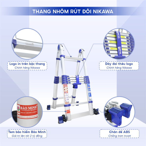 – Thang nhôm rút đôi Nikawa NK-38AI-Pri được sản xuất theo công nghệ Nhật Bản, đạt tiêu chuẩn an toàn Châu Âu. Được làm bằng chất liệu nhôm hợp kim nhôm cao cấp siêu bền. sáng bóng, chịu lực tốt và không gỉ sét.