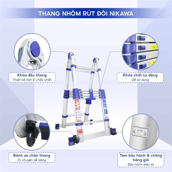 - Khoá kép to hơn, chắc chắn hơn. Đối với các dòng thang nhôm rút đôi phiên bản 2023, NIKAWA đã cải tiến sản phẩm với khoá kép to và chắc chắn, càng làm cho dòng thang này chất lượng hơn bởi độ chắc chắn và an toàn của dòng sản phẩm đem lại cho người sử dụng.
