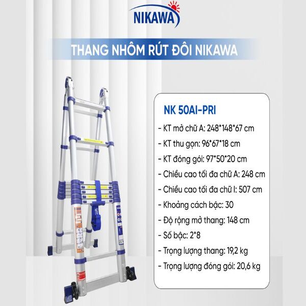 Thang nhôm rút chữ A Nikawa NK-50AI-Pri là model thang có chiều cao nhỏ nhất nằm trong dòng thang nhôm rút đôi cải tiến mới.