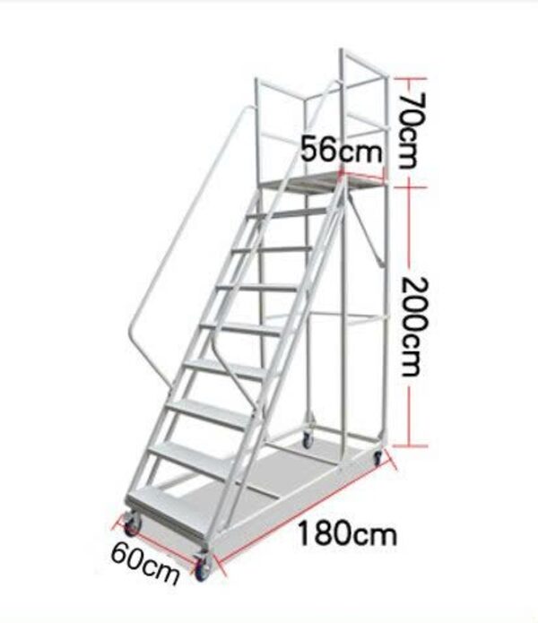 Xe thang di động cao 2,0 mét có lan can là một loại thang có khả năng di chuyển, được trang bị thêm lan can để đảm bảo an toàn khi sử dụng, đặc biệt là ở những vị trí cao. Thang này thường được sử dụng trong các kho hàng, siêu thị, hoặc các khu vực sản xuất để công nhân có thể tiếp cận các khu vực cao một cách an toàn và tiện lợi.
